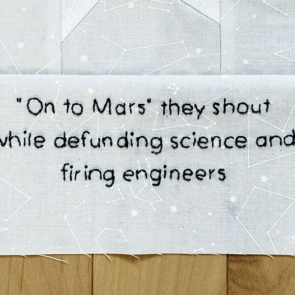 This year I made 7 baby-size and larger quilts, 9 mini quilts (including 1 with each of my kids), 1 tote bag, 1 quilt coat, and several more of my signature quilted fabric postcards. I made a few quilt tops that aren’t included in the previous totals because they’re not finished yet (eep). I released 4 patterns, and did plenty of tech editing and graphics work for others. I gave 21 guild lectures and taught my first guild workshop.