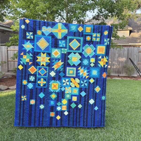 The real fun came during the quilting and finishing process. I got my Intelliquilter installed on my longarm in March, and had done some practice in April, and finally felt confident to load an actual quilt for computerized quilting!! I used the Rolling Hills pantograph from Julie Hirt and I’m happy to report that the process went very smoothly. I have at least a dozen other quilt tops hanging around my sewing room and look forward to a lot more computerized quilting practice in my future.