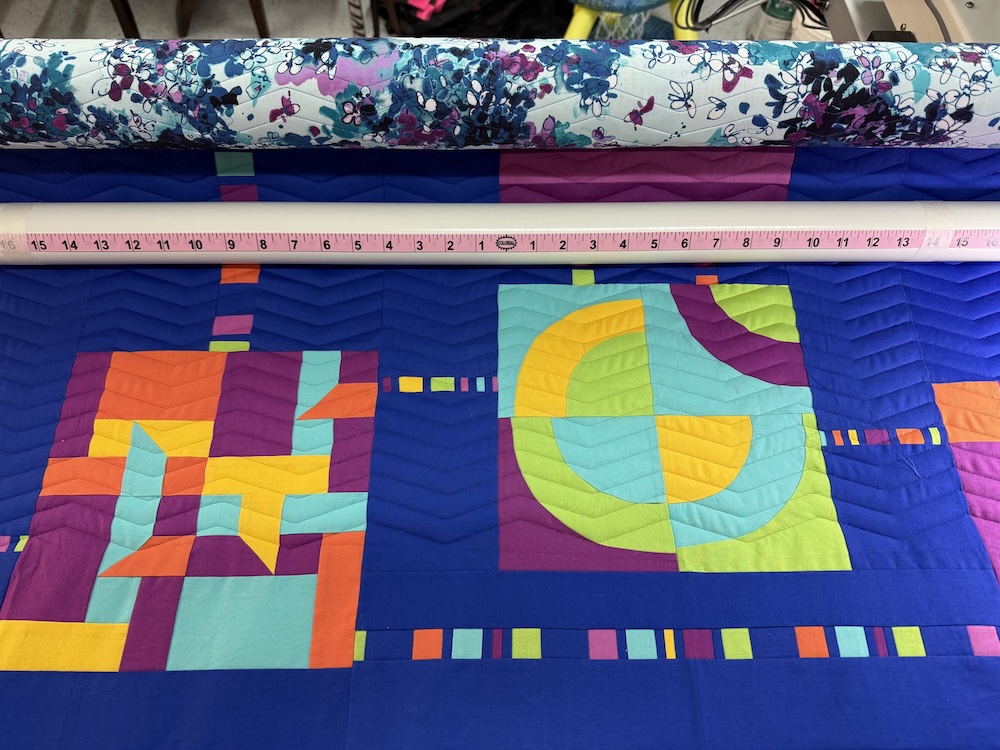 For the quilting, I took advantage of the opportunity to try a few new things on a quilt that wouldn’t have to get juried in to hang in the show! (Ha.) I used wool batting for the first time and love the puffiness it added. I also used dark monofilament thread for the quilting, which I had only used with my longarm once before.