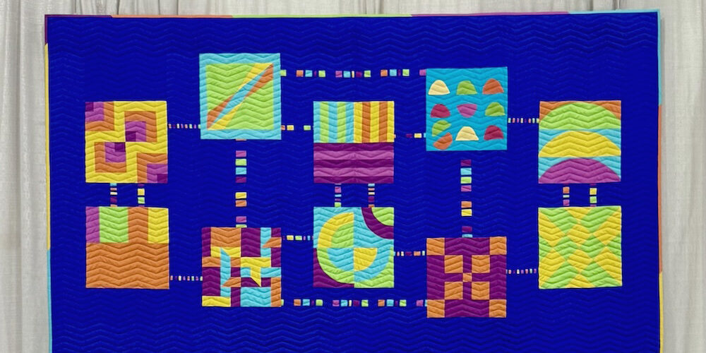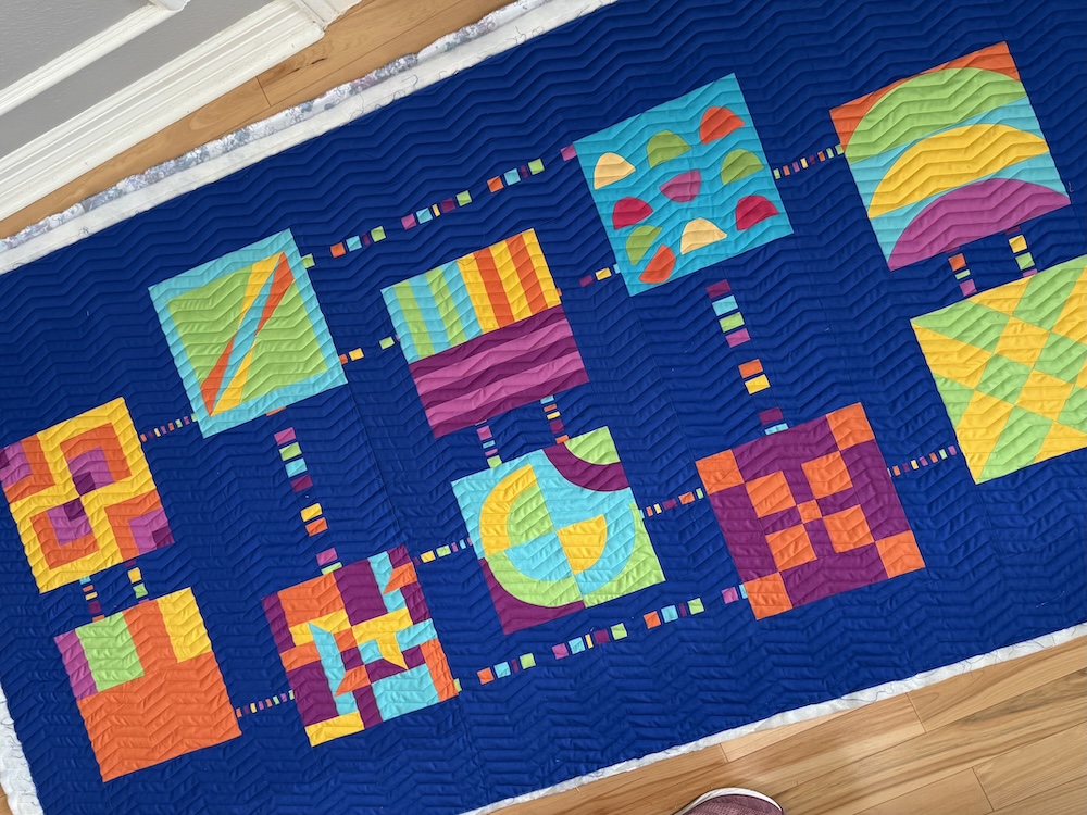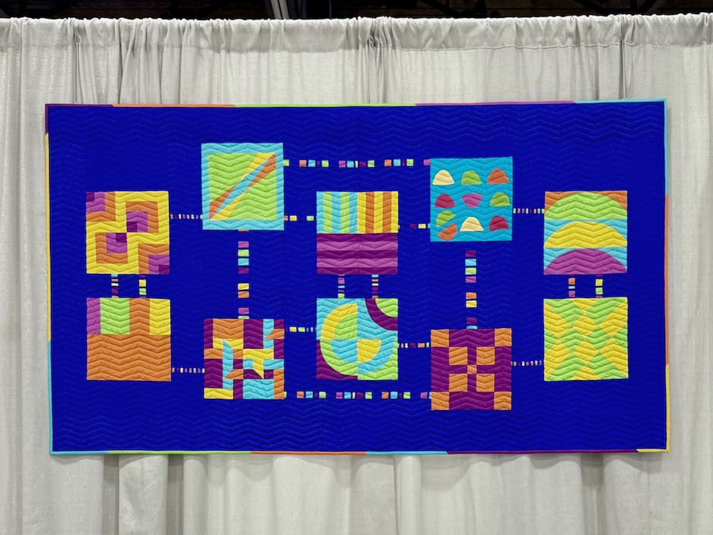 Dianne spearheaded the effort to identify colors (using the MQG and QuiltCon logos), collect blocks, and piece them into a quilt top. She then mailed it to me and I quilted it, bound the edges, and added a hanging sleeve.