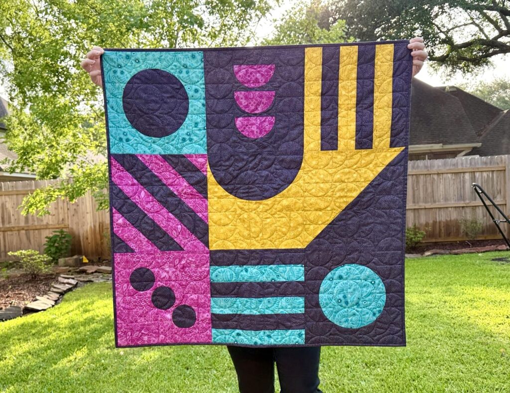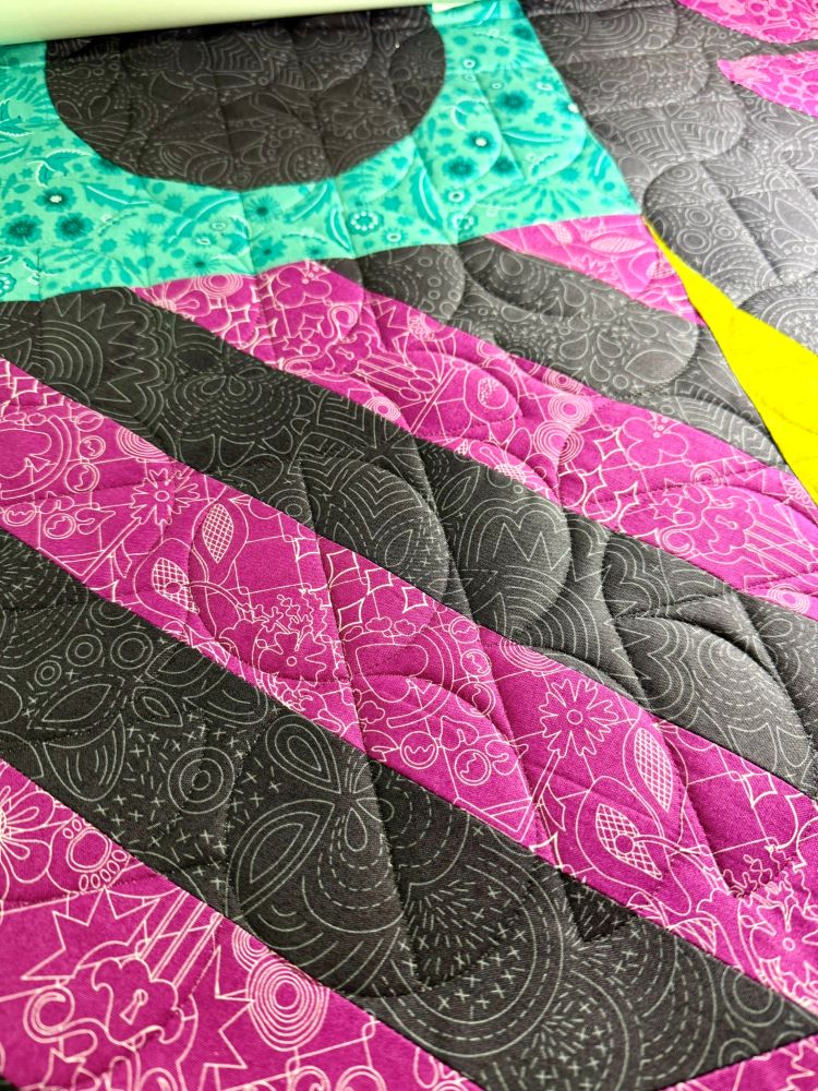I don’t have an end destination for this quilt, so I used it as an opportunity to experiment. I chose a pantograph with a decent amount of backtracking that would need to be aligned fairly precisely from row to row to look good. Moon Phases (by Mistletoe Quilting Co) complemented the circles and half circles in the piecing nicely, and I really love the look — I’m sure I’ll use this panto again at some point.