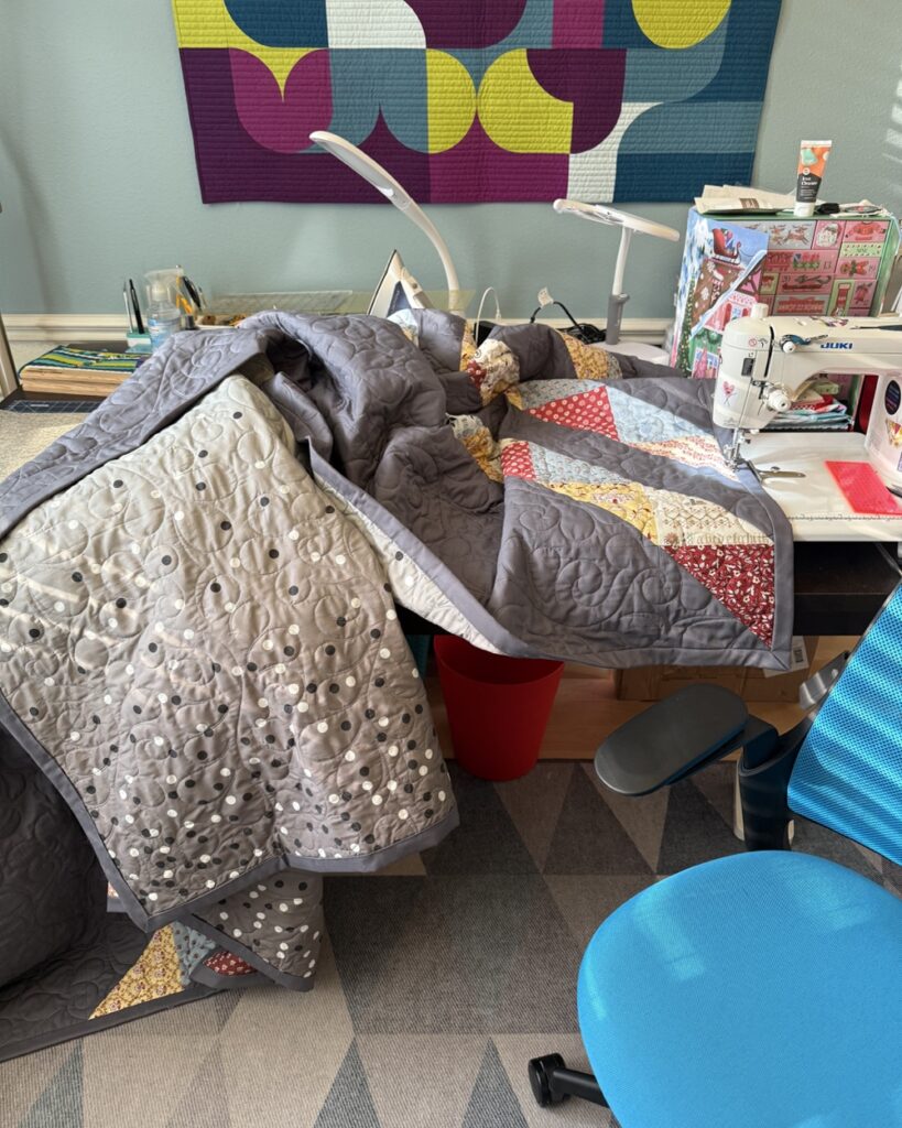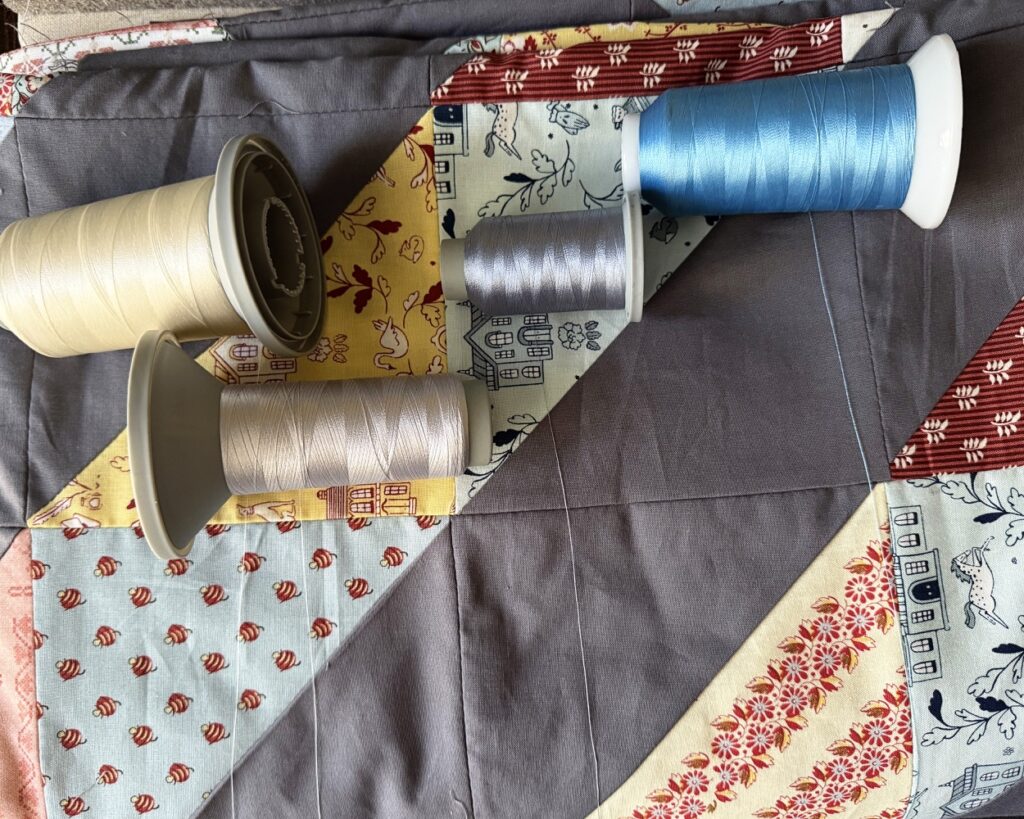 Carter is living in Europe at the moment, so he shipped me the quilt top in early November and we corresponded via text. I had a few thread options and we both thought the silver (small spool 3rd from left in the photo above) would work well. It matched the gray background fabric, and blended well with all of the prints.