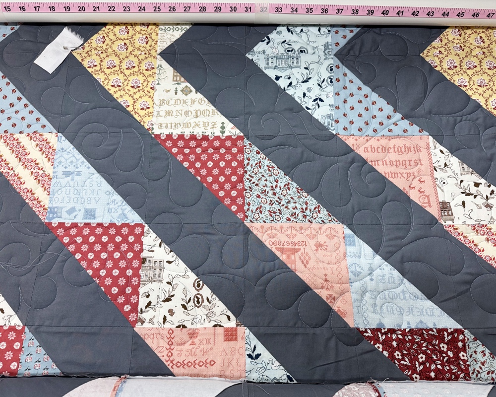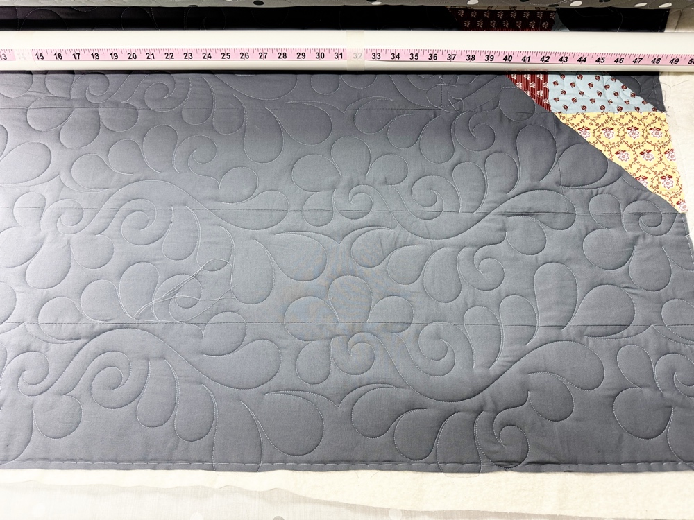 From there I got to work! Carter chose Fishtail Palm, a free pantograph from Urban Elements. It’s not what I would have chosen at all, and yet once I got started, I agreed that it looked really beautiful on this quilt! The piecing is modern and angular, and the swoopy curves of the panto softens it up and provides nice contrast — and also looks great in the negative space of the design.