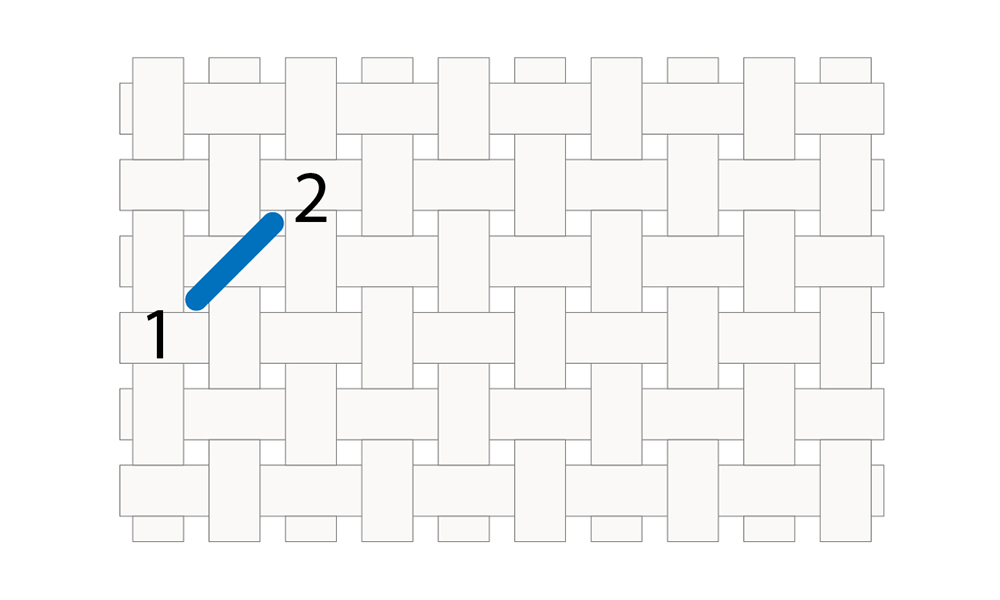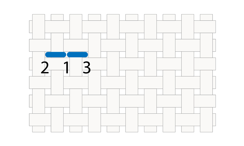 To begin, bring your needle up through one hole (1) and down through the hole directly behind it (2). Next, bring your needle up through the hole that’s two stitches ahead along your intended path (3), and back down through the hole where your first stitch began (1).