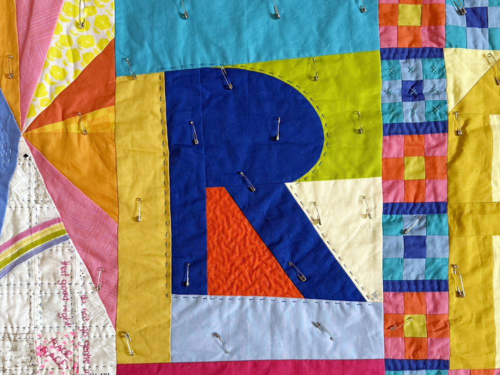 I also spent a bit of time adding hand quilting to a fun group quilt I was invited to participate in. I made this R block back in late May. Now that the quilt is put together and basted, we are sending it around for each person to contribute to the hand quilting. I added an outline around my R, and some X stitches on a few of the small 9-patches…plus some other quilting in areas that aren’t pictured here.