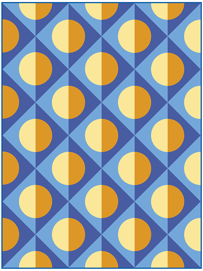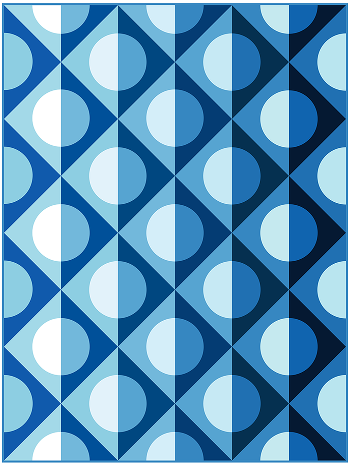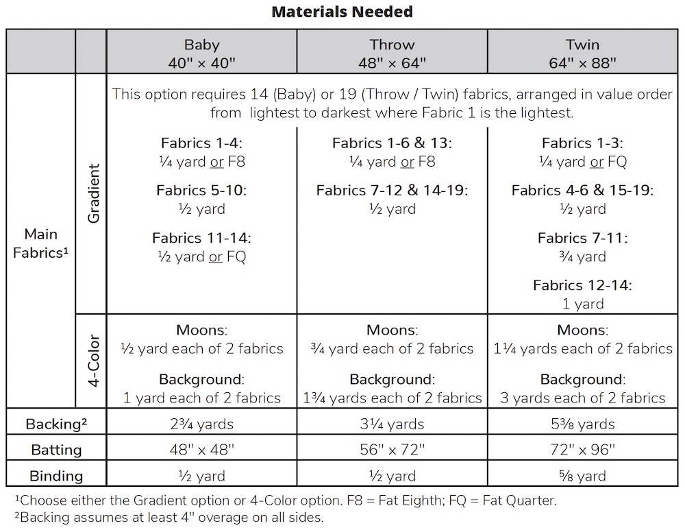 The fabric requirements for the gradient option are a little more involved than usual, simply because of how the different fabrics are arranged and where each value is used to create the gradient effect. You’ll need 14 fabrics for the baby size quilt, or 19 fabrics for the throw or twin size quilt. In each case, your selection should run the full value range from light to dark. (I made my throw-size version with a set of 19 half-yard fabric cuts from Karen Nyberg’s upcoming Earth Views – Oceans fabric collection.)