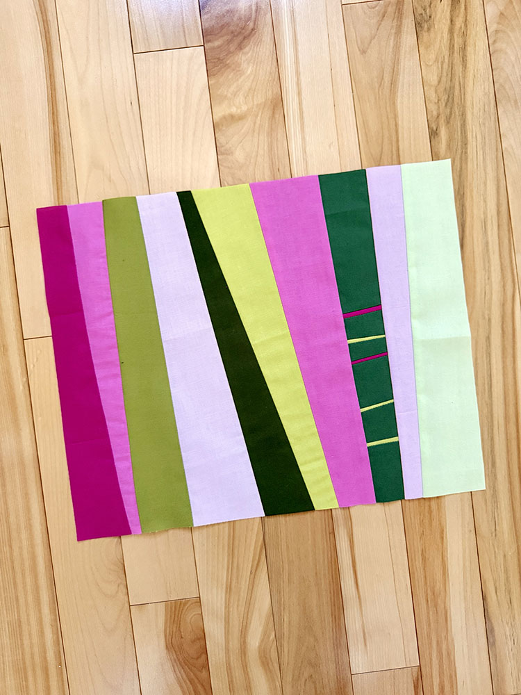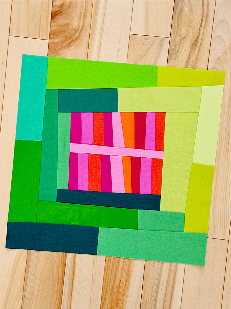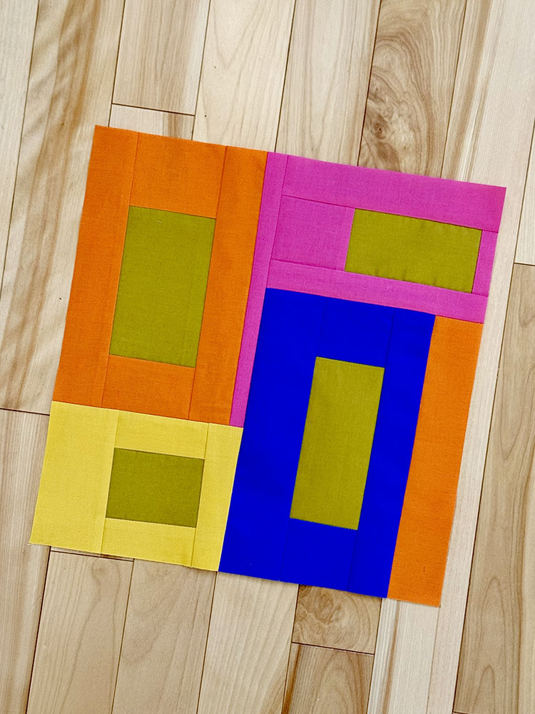 For September, Chris asked us to use Kona Pickle (or very close) plus a range of saturated pinks, oranges, yellows, and blue/purples to make blocks featuring either rectangles or circular curves. I embraced the rectangles and made a fun modular-looking block.