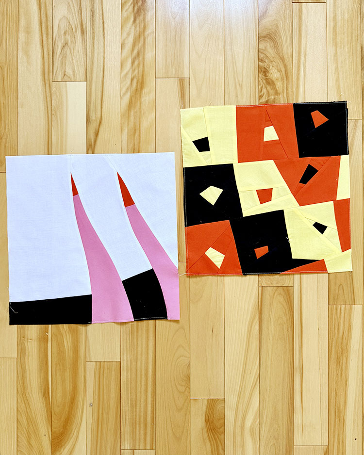 In February, I made two blocks for Sarah, who requested any kind of improv piecing using the word “fizzy” as loose inspiration. She also provided specific color palettes. The block on the left is black, white, carnation, and a hint of tangerine, and the the one on the right is citrus, tangerine, and black.