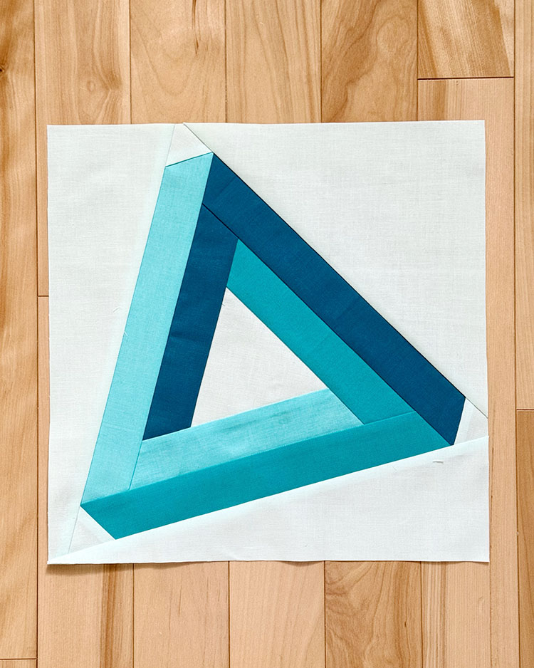 For March, E.A. asked for illusion block — such a great prompt! This admittedly was not improv piecing, but some precision is often necessary to making illusions look their best. I chose to make a Penrose or “impossible” triangle — a shape that cannot be made in three-dimensional space.
