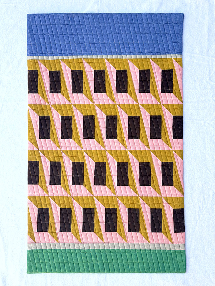 And finally, name! The strong, sloping lines of the building facade that inspired my quilt stand out in the piecing and quilting. The phrase “rise over run” is commonly used to describe the mathematical formula for the slope of a line. As soon as I thought of it, I knew Rise Over Run was the perfect name!