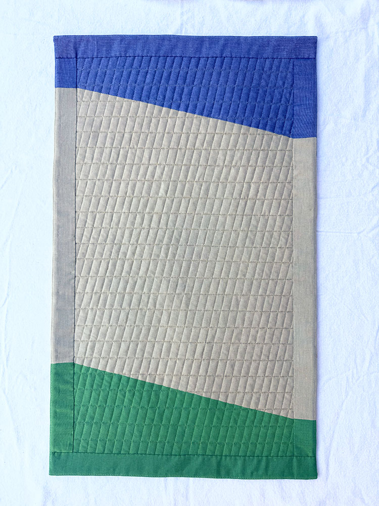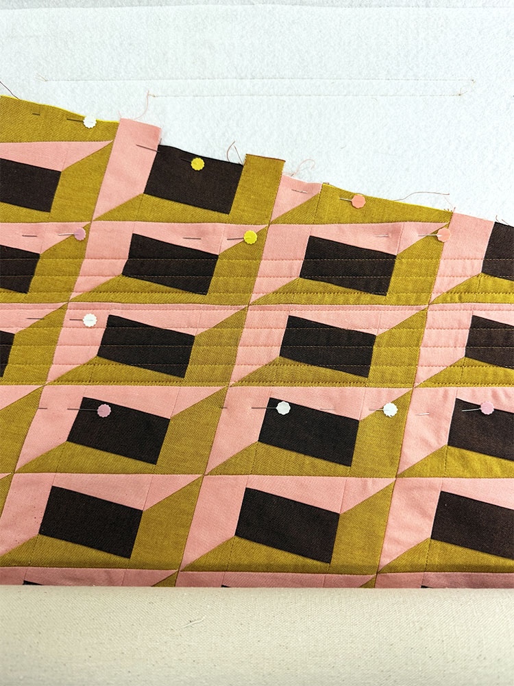 I used most of my yellow, pink, and brown fabric for the top, but I had plenty of blue, gray, and green left over for the backing. When you load a quilt on the diagonal as I did with this one, the backing seams end up diagonal, which complemented the design on the front. And then on a whim, I made the facing strips line up with the backing! That might be my favorite detail of the whole thing, and it’s not even visible. Ha.