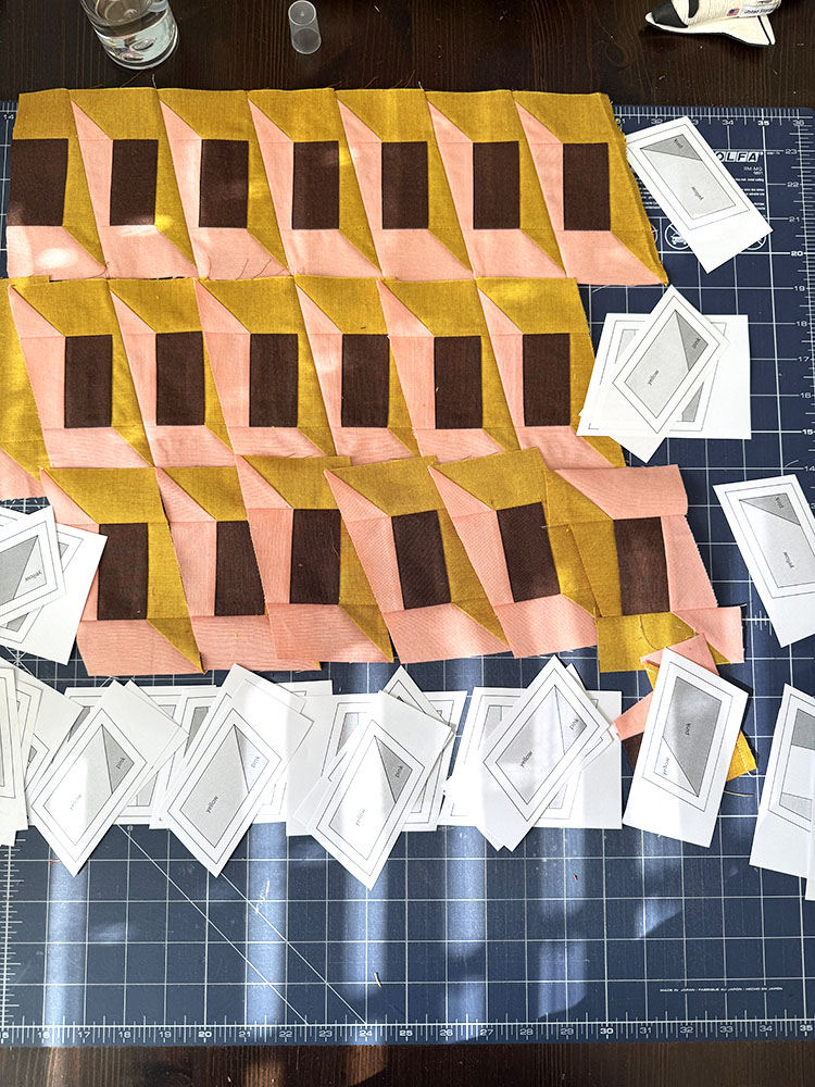 Each block has 3 sections, but each section only has 2-3 pieces, so they came together quickly enough. The trickiest part was lining up the corners as I joined blocks and then rows. Many pins were required!