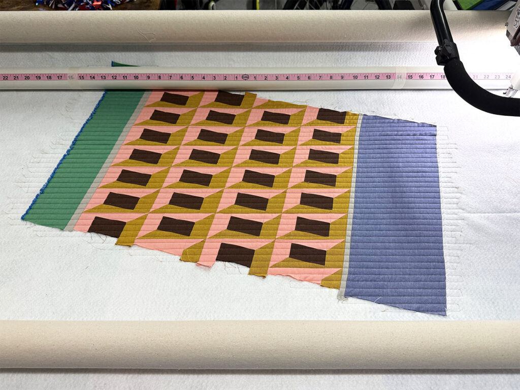 I loaded the quilt on the diagonal first, using many pins to keep things straight as I echoed the slanted lines. After that pass, I removed the quilt and trimmed the backing to about 4″ on each side. Then it went back on the longarm for the horizontal lines. This is the first time I’ve re-loaded a quilt on this particular machine but thankfully it went pretty well! I had to bit of stretching/smooshing (technical term, ha) to make sure the horizontal lines were properly aligned. I didn’t get it perfect, but I definitely got close enough.